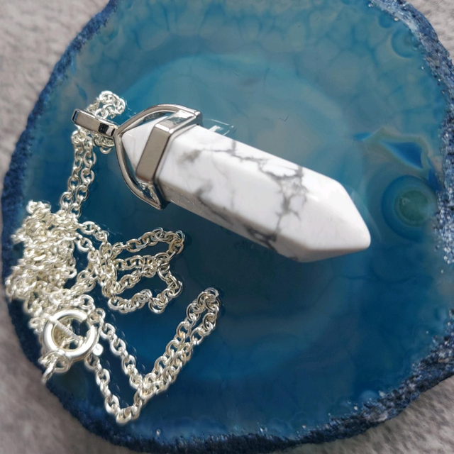Howlite representing the air element and Gemini. Possesses a calming effect, helps against stress & anger, aids inspiration, creativity, artistic expression, insomnia. Strengthens memory, teaches patience, eliminates rage, good for communication. Helps soothe pain and is particularly helpful for osteoporosis